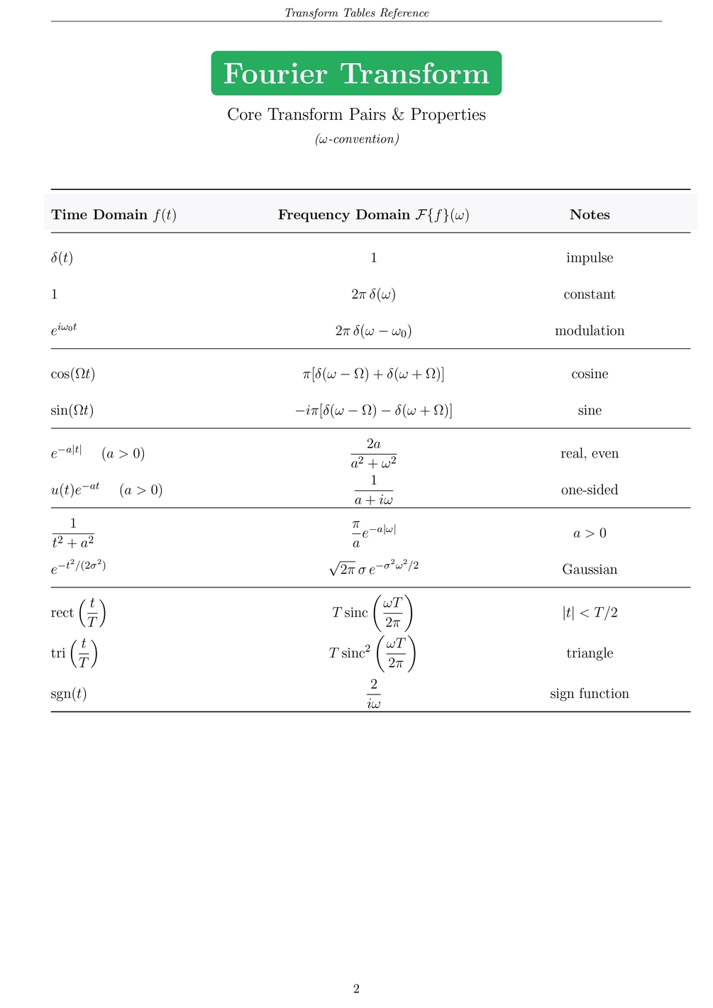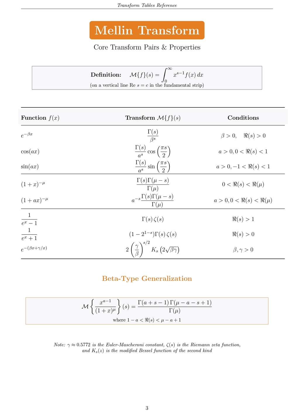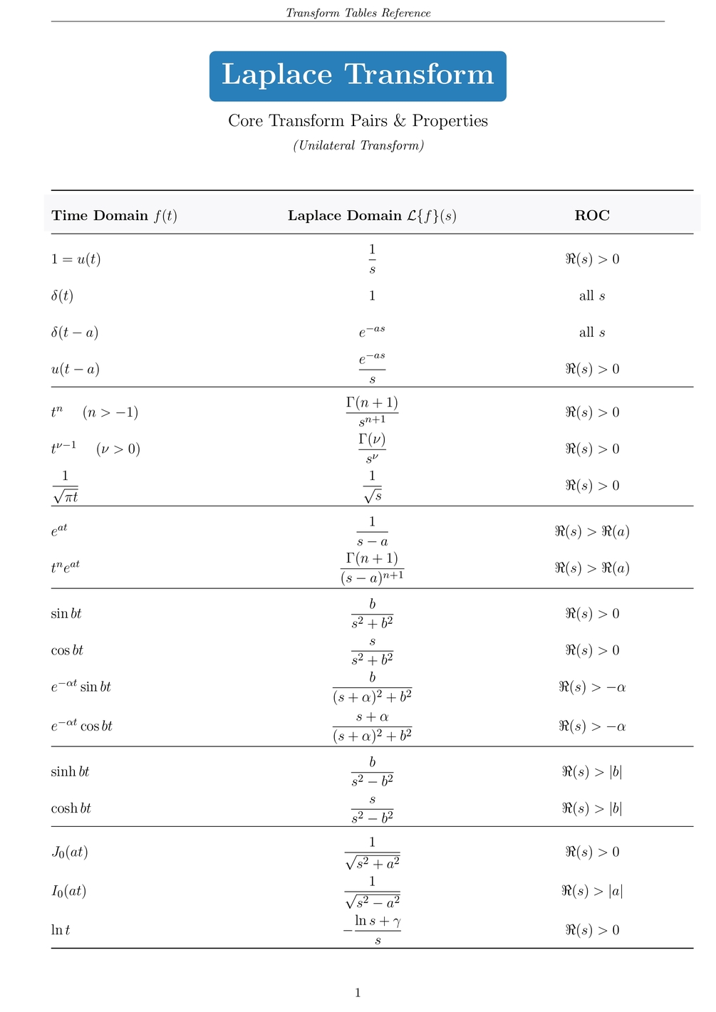 - Core pairs for Laplace/Fourier/Mellin: exponentials, sin/cos, Gaussians, step/impulse, sinc/rect, common rational forms, etc.